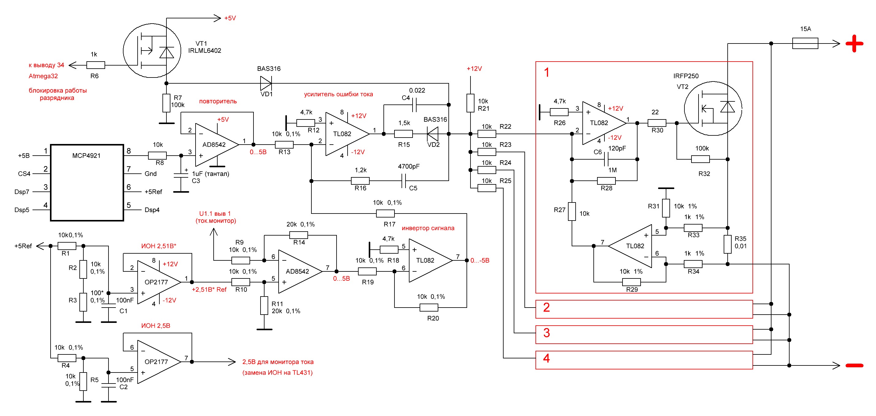 Это силовая часть эл.нагрузки (силовая плата), а продолжение схемы на плате управления. Я привёл полную схему для лучшего понимания работы. Для тех, кто желает лучше понять и разобраться в её работе.