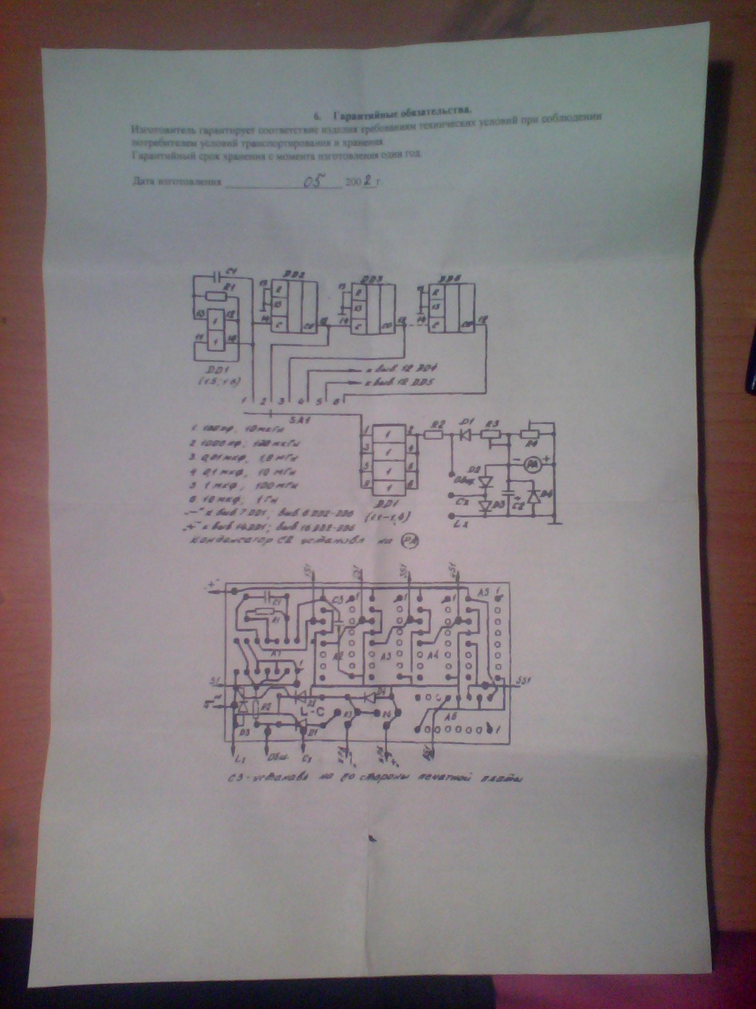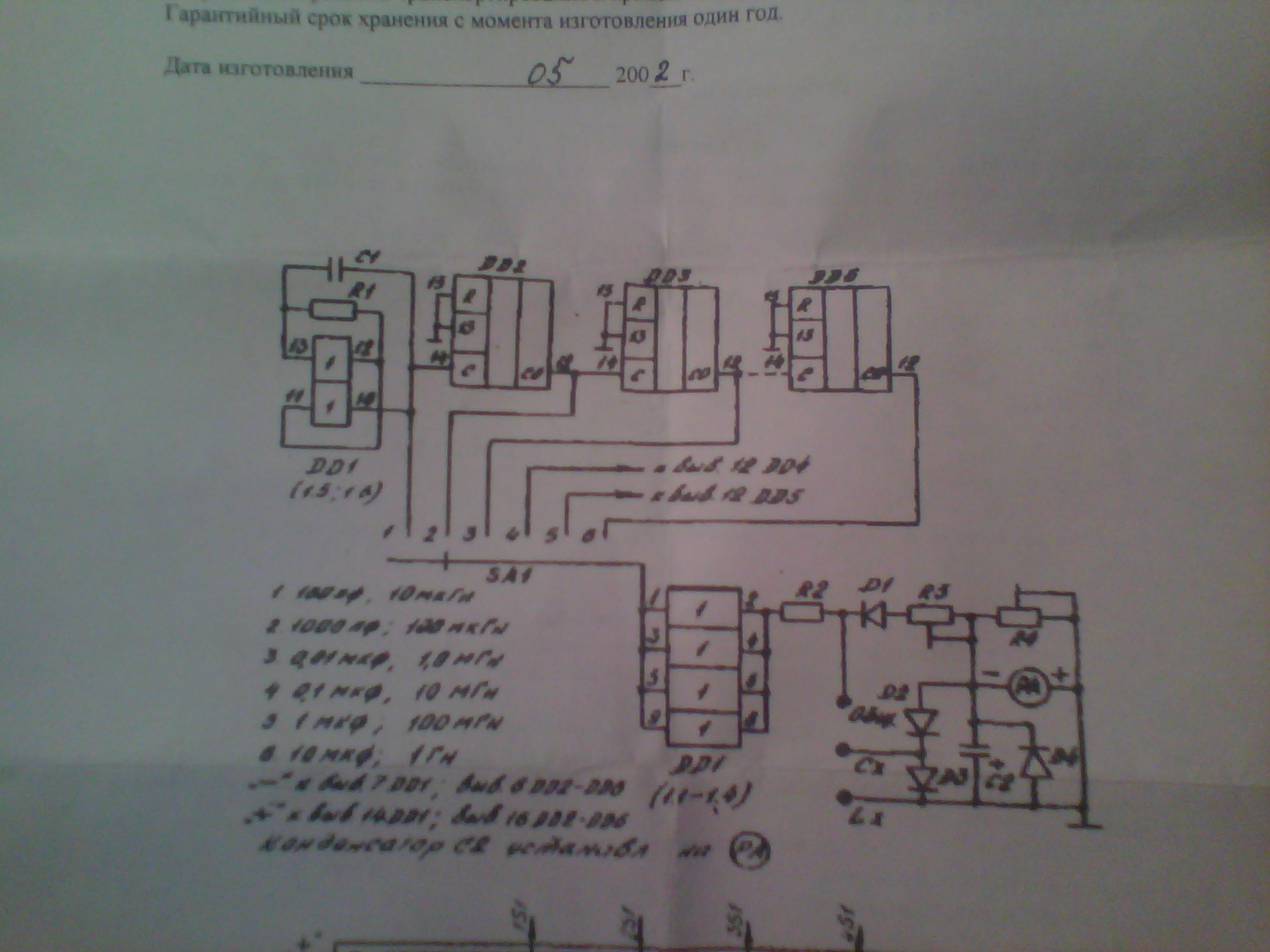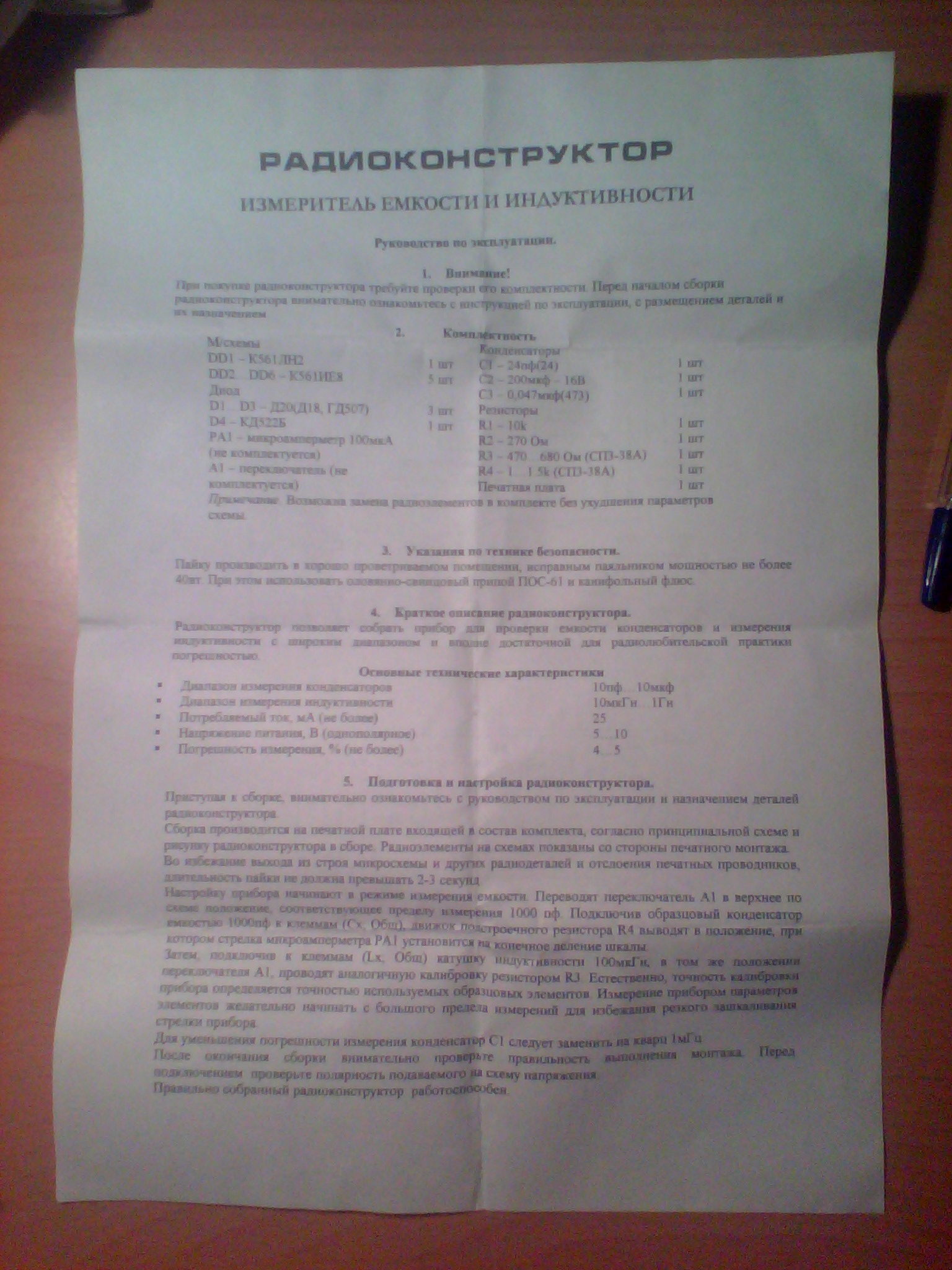 вчератв магазине электронщик за 123 рубля мною был приобретен радиоконструктор #5 - измеритель емкости и индуктивности. в составе набора: односторонняя печатная плата, несколько микросхем, диодов,кондёров и резюков. в комплект не входят шестипозиционный одногруппный переключатель выбора предела измерений, микроамперметр на 100 мкА, который можно заменить мультиметром, и цепи питания 5-10 В. подробности с фото позже. сайт elcotel.ru