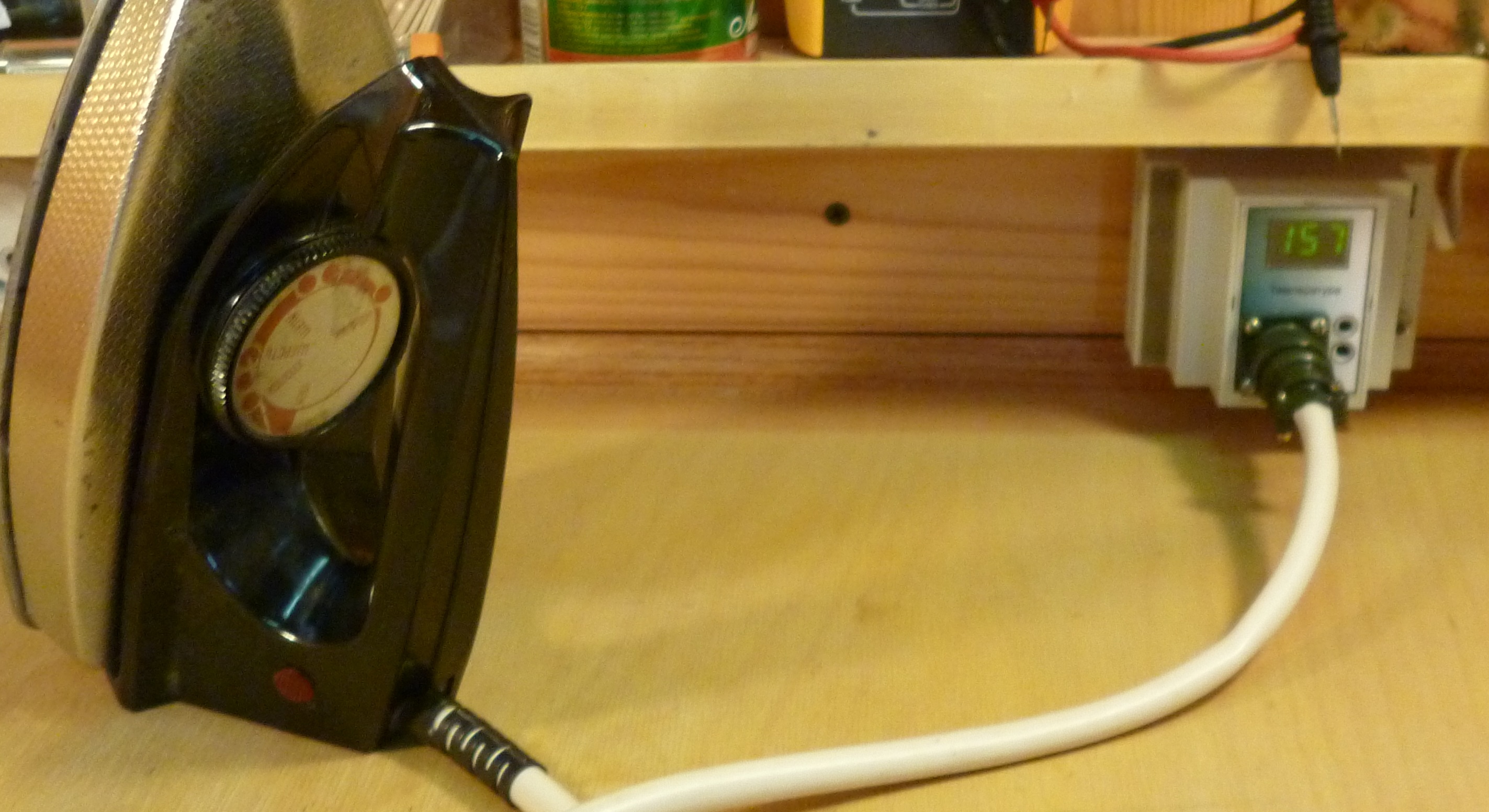 Схему термопары взят отсюда, http://chipmk.ru/index.php/ves-mater/12 ... -termopary , немного переделал, ибо использовать диод на входе в качестве стабилизатора напряжения недопустимо, изменяет прямое напряжение в зависимости от температуры наружного воздуха, проверял, термопара от обычного китайского мультиметра. Пример реализации ПИД регулятора здесь http://www.mcu.by/avr-%D1%83%D1%80%D0%B ... 2%D1%8C-1/ , там три части это ссылка на первый урок (рекомендую посмотреть все видео, особенно вторую часть). Если есть желание использовать пример в "лоб", то в качестве выходного управляющего элемента нужно ставить твердотельное реле. Если хотите использовать симистор, ШИМ придется писать самим. Вся документация (что есть) находится в архиве, программа полностью работоспособна, проверено. Хотя программный код требует еще доработки и лишен "изящества" (буду рад улучшением и доработкам). Все желающие могут переписать под свои нужды, к тому же в уроке есть исходник кода. Коэффициенты подобраны мной для конкретного утюга Kp = 18, Ti = 4, Td = 28 (Настройка ПИД коэффициентов), для реализации ваших объектов подбирать придется самостоятельно, интегральную составляющую рекомендую ограничить (см. комментарий в программе). И фото напоследок. Надеюсь все это кому-то пригодится.