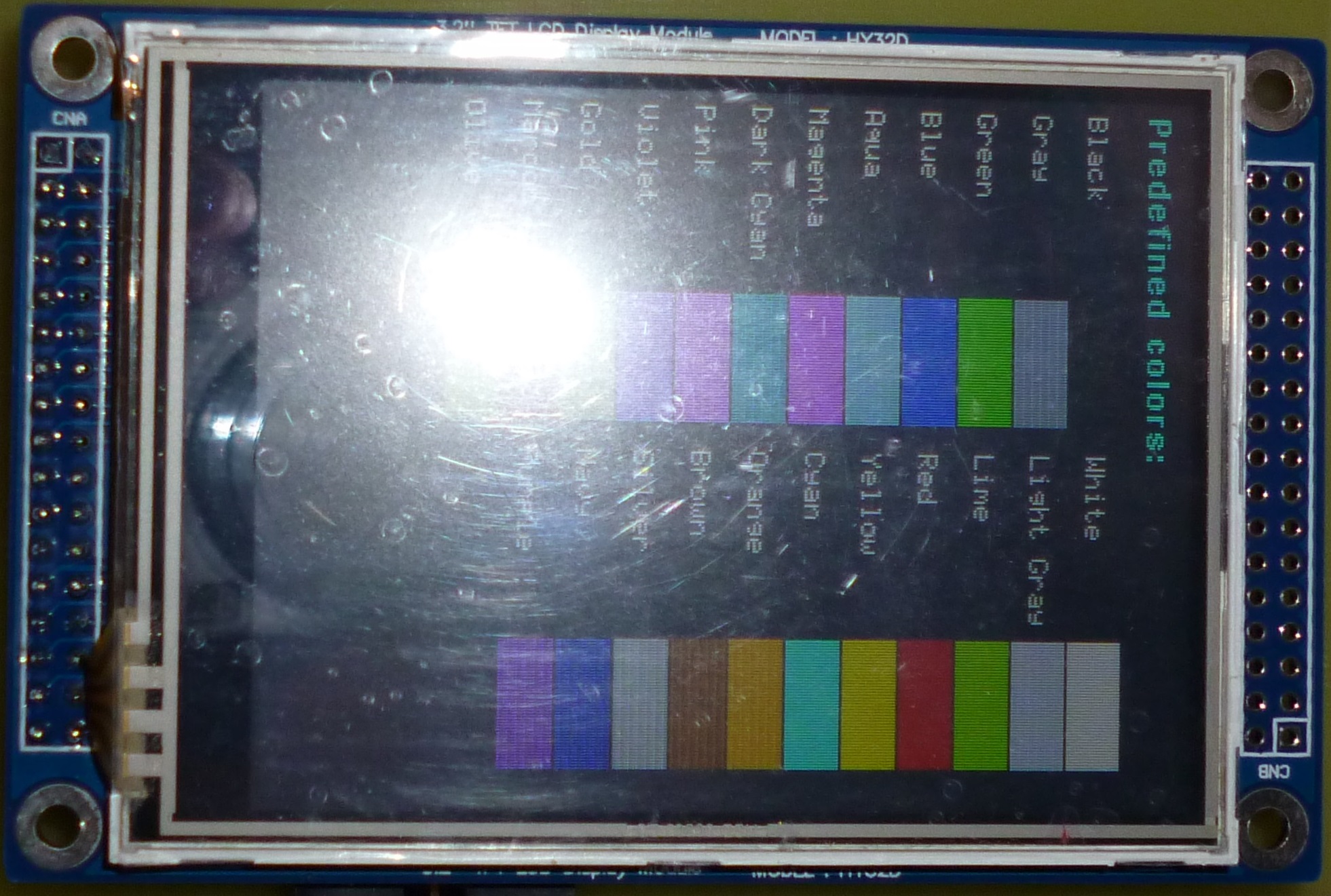 Одно важное замечание для тех, кто уже купил этот дисплей. При отрисовке графических примитивов в rgb565, все нормально, вы не заметите артефактов. Артефакты обнаружатся, когда вы будете подавать данные, например с камеры. Возможно есть еще какие варианты, но единственно чем мне удалось исправить эту ситуацию, это установкой в регистре 0x3A значения 0x06, и шинковать данные о цвете последовательно по 6 бит (grb). Всё по 8-ми битной шине данных (поэтому лучше юзать YUV, великолепная stm-ка справляется на ура), картинка отрисовывается за 1.8с, может и быстрее, но для моей задачи хватает. Шлейф старшего байта в данном режиме можно не подключать, выводы дисплея старшего байта надо заземлять (см.даташит), только так удалось добиться реалистичной цветопередачи. Если по отдельности устанавливать значения в старший байт в данном режиме вы вообще ничего не увидите, странно, но у меня именно так. Поэтому, для картинки и графики лучше использовать rgb565, если что-то не устраивает возможен такой вариант.