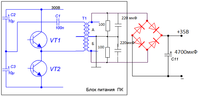 Собираю БП для ЧПУ станка на основе БП от ПК, напряжение 30-35 вольт 8-10 ампер. Делаю выходную обмотку по мостовой схеме (примерная в приложении). И возникла проблема. В таком варианте без нагрузки относительно общего провода на плюсе 15 вольт, а на минусе 20 вольт. А при подключении нагрузки на обоих полюсах по 15 вольт. В итоге без нагрузки 35 вольт, под нагрузкой 30 вольт. Вот... Как избавиться от такого перекоса?