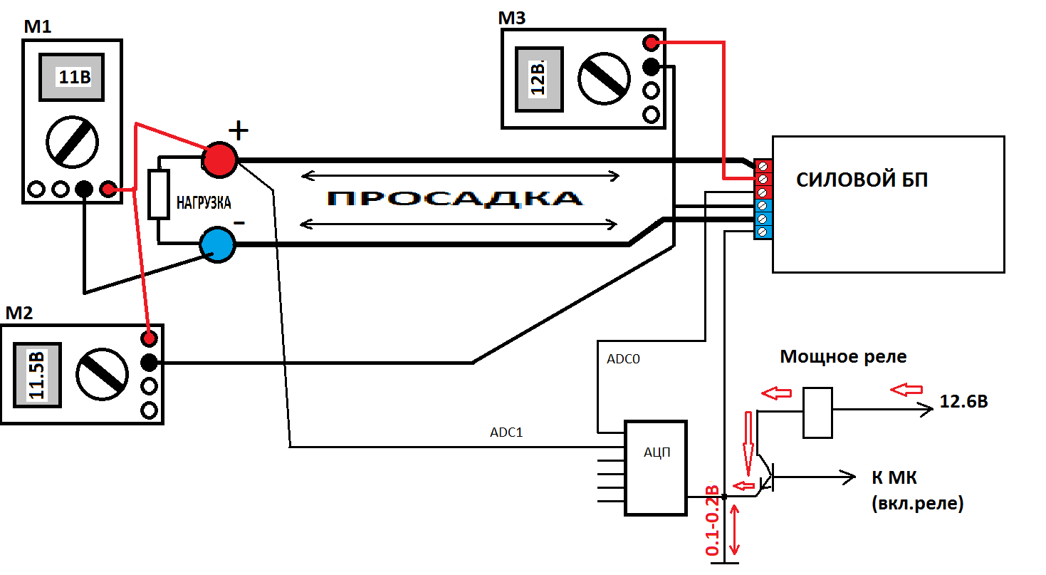 Спор был из за того, что предлагалось делать замер напряжения непосредственно на клеммах ЗУ. В этом случае, как утверждал мой оппонент, не нужны никакие корректоры. И, мол, это "костыль". При этом он не учитывал то, что по минусу ведь тоже идет просадка, а меж тем АЦП делает замер относительно земли силового БП. Согласно моей схеме-примеру, вранье АЦП в этом случае составит 0.5В. И это без учета возможного "плавания земли" от мощного реле и тд. Вот тебе и "костыль".