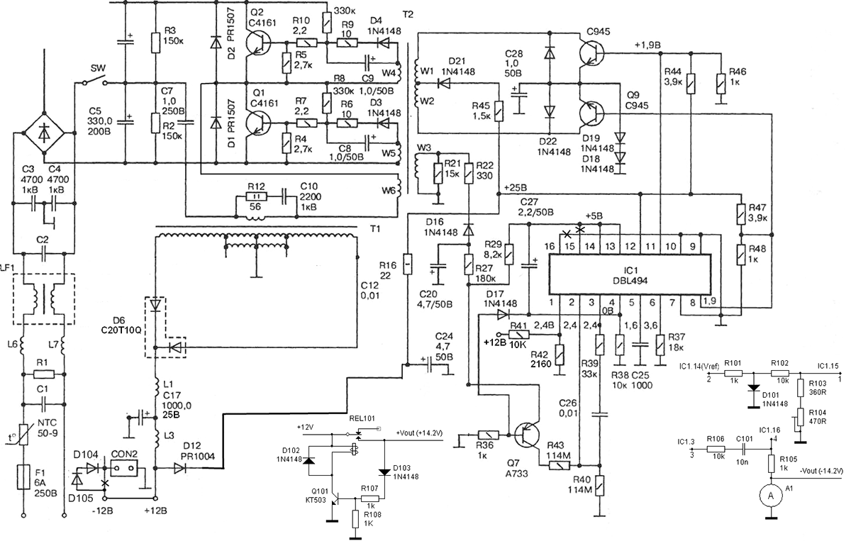 БП Китай самый обычный. 2SC4161 силовые 400V/7A, DBL494 какой то аналог TL494. В нём не хватает тр-ра 220В-220В, отсутствуют фильтры, проходной конд. Коллеги ищите нормальные БП для переделки. Прав был Алексей, силовая часть сложнее управляющей. А ещё когда знаний мало.