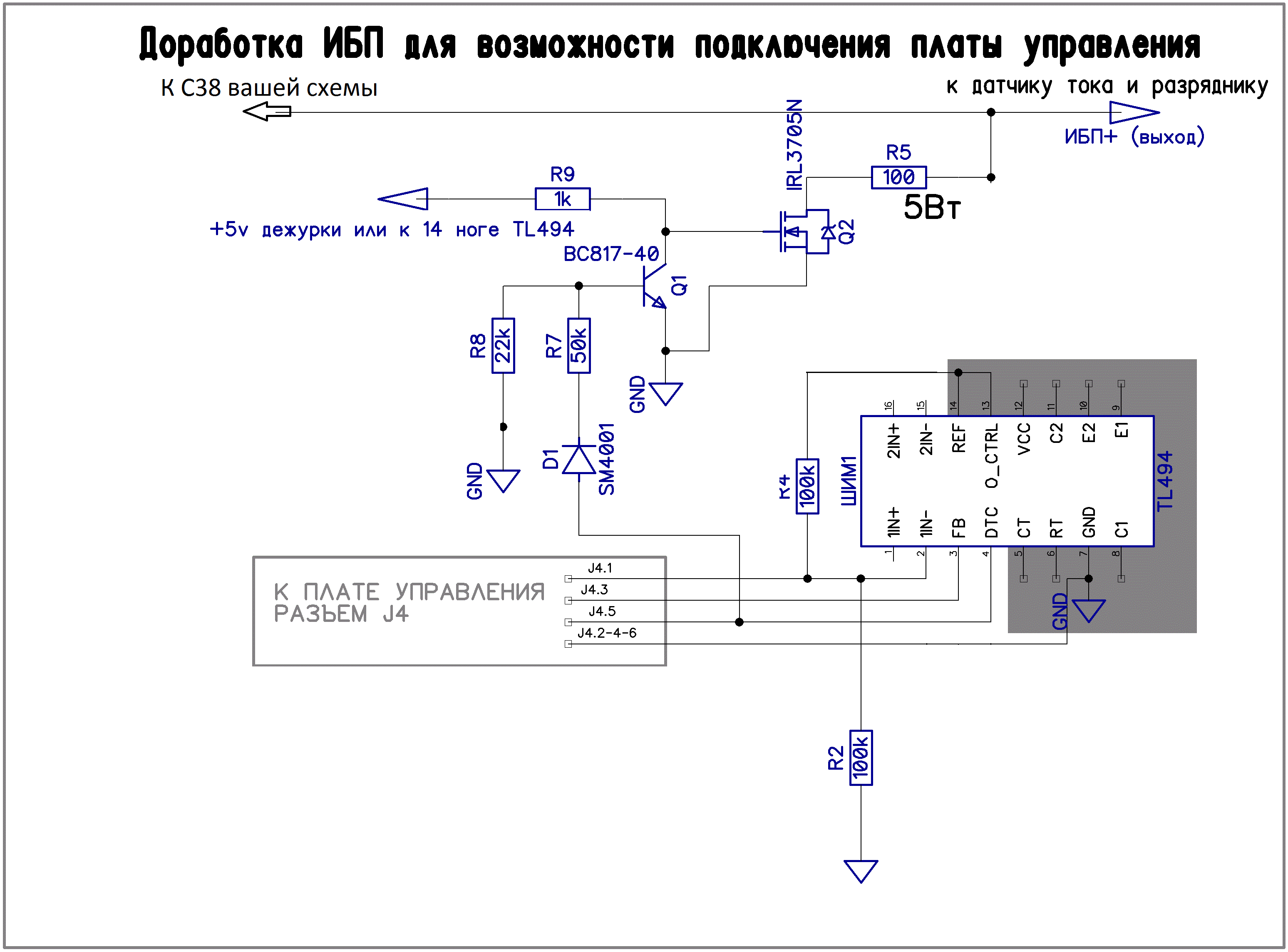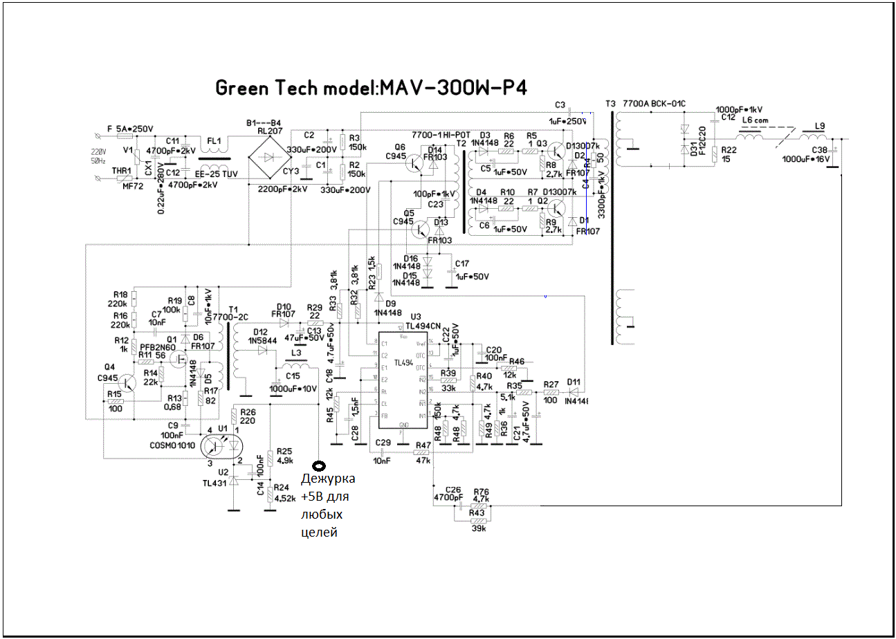 С38 плюсовой вывод подключаем к указанной точке на схеме доработке и собираем цепь из 5вт-100ом (допускается вплоть до 200ом) резистора, электронного ключа на полевике, инвертора на аналоге кт315 (Q1). Питание для всего этого можно взять хоть с дежурки канала 5в (она осталась не у дел), хоть с 14 ножки TL494. В последнем случае нужно помнить то, что внутренний стабилизатор на 5В у нее слабенький и годится только для указанной цепочки без каких либо переделок. Подключать большую нагрузку туда нельзя.