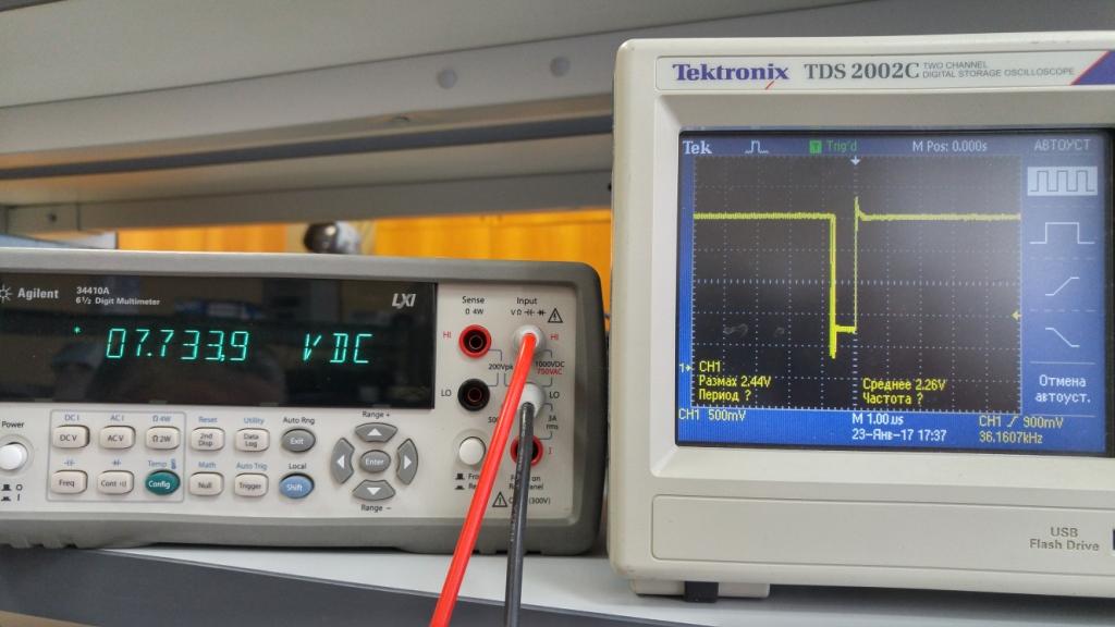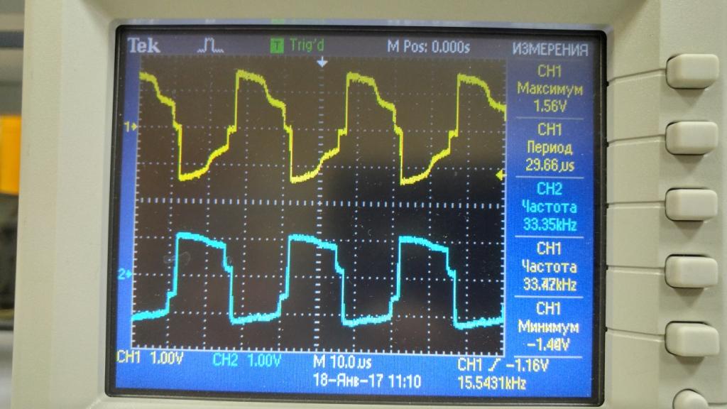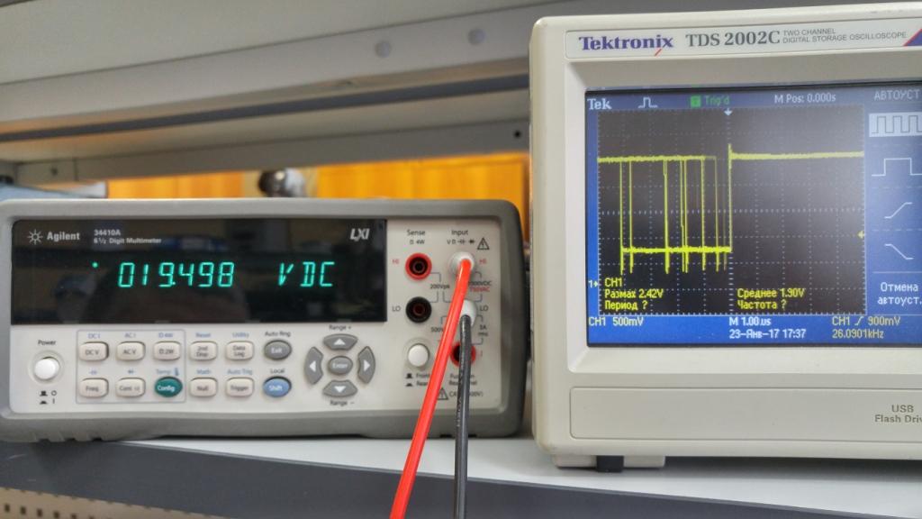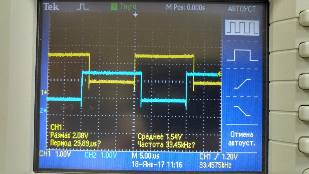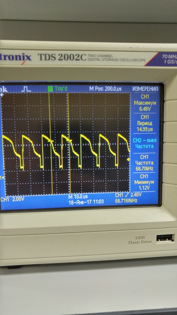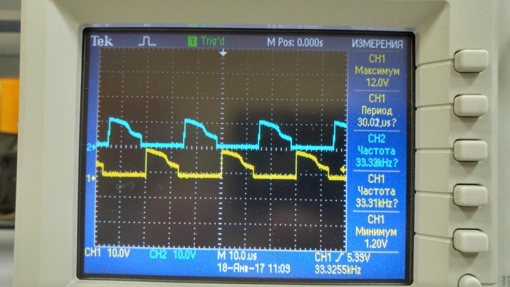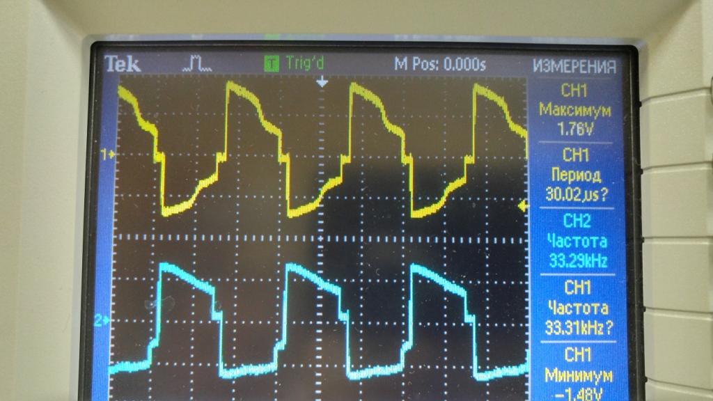 Спасибо за книгу! Все настроил, проверил с нагрузкой до 5А больше нечем нагрузить. Пока к ПУ не подключал. Резистор на тгр пришлось уменьшить до 150 ом из-за него угол заваливался. не хватало питания. На осциллографе выше видно.