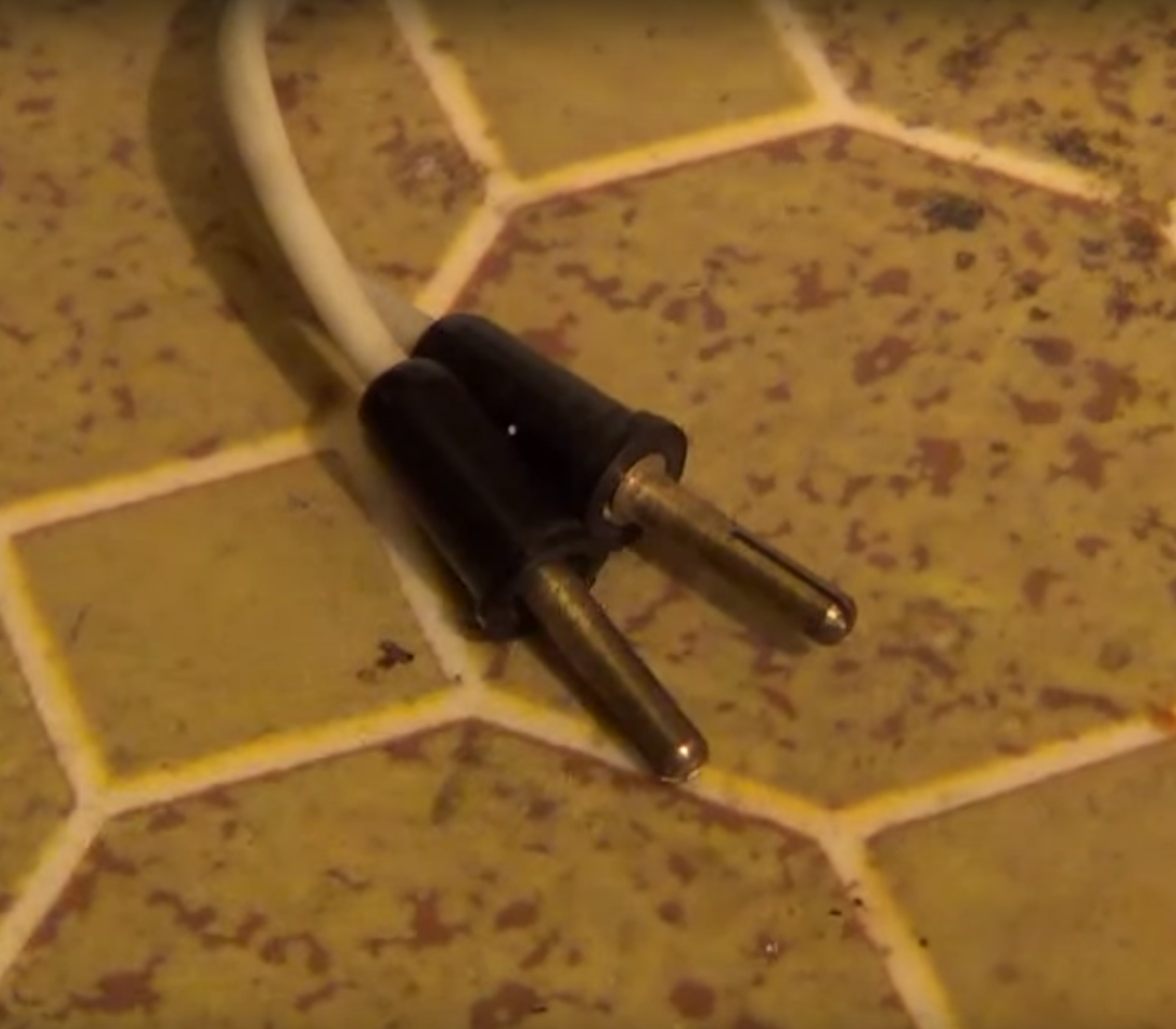 Для начала пойдёт любой экранированный кабель. Можно антенный, не сильно толстый - сейчас ПОФИГУ волновое сопротивление. Посмотреть импульсы размахом до 5 вольт пойдёт, да и частота там не высокая. С одной стороны этого кабеля - два "банана" (см. фотографию), с другой стороны - на оплётку кабеля припаиваем небольшой крокодил, к центральной жиле кабеля - иголку. Но для начала вообще можно ни крокодил, ни иголку, не делать - оплётку припаиваем к минусу силового БП (разумеется,к "холодной" его части, то есть там где нет 220-310в), а центральную жилу через резистор 1ком припаиваем к коллектору VT7 (смотрим импульсы) и потом тоже самое делаем с VT8