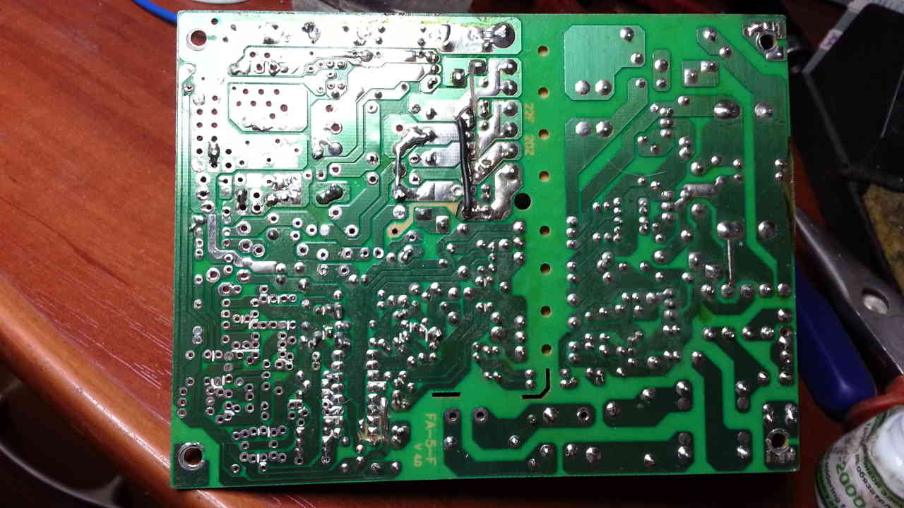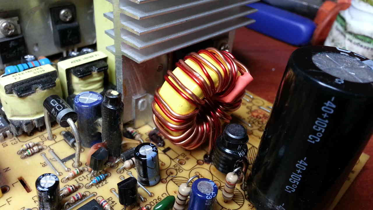 Я что то может упустил либо ткните носом к какому виду привести комповый БП? Я на данный момент убрал всё лишнее возле TL и полностью распаял -12В,5В,3,3В. Размотал дроссель и намотал заново, при этом число витков увеличил раза в 2 и для намотки соединил в параллель проволоку от 5 и 3,3 вольтового канала. Так же запараллелил диодные сборки 12 и 5 вольтовые которые уже были установлены. На фото видны перемычки и вид получившегося дросселя. Так же поставил кондёр на выход 10000мкФ 35В. Простейшее включение на выходе показало 23,6 вольта по максимуму в холостом режиме. Что выдаёт по току проверить не получилось, не оказалось необходимой нагрузки.