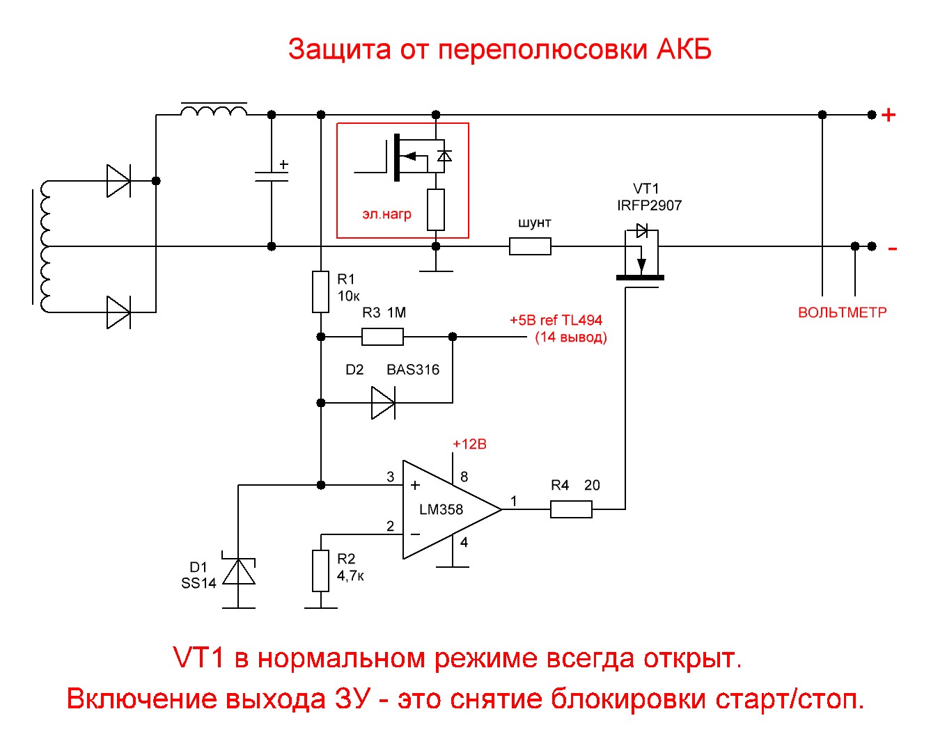 Всем привет! Наверно уже пора избавляться от силового реле, которое занимает много места, потребляет лишний ток и с качеством есть проблемы. И чтобы немного усложнить схему. Переполюсовка штатная на оптроне срабатывает при обратном напряжении на клеммах устройства более 2,5В. Хочу поделиться схемой защиты от переполюсовки для зарядного устройства. Вместо реле используем полевой транзистор с малым сопротивлением перехода в открытом состоянии. Транзистор находится всегда в открытом состоянии при отсутствии выходного напряжения, при его наличии и при подключенном АКБ правильной полярности. Закрывается он только при подключении обратной полярности АКБ. За этим следит компаратор на LM358, который фиксирует напряжение обратной полярности в цепи конденсатора фильтра силового БП. Достаточно величины до -50мВ на конденсаторе фильтра для срабатывания компаратора. Это ему не навредит. В этой цепи так же стоят силовые диоды выпрямителя и диоды транзисторов электронной нагрузки, но сработка схемы происходит раньше чем обратное напряжение на диодах достигнет величины для их пробоя (более 200мВ). При переполюсовке АКБ потребление тока от него схемой не более 1мА. Схема протестирована в макете и показала надёжную работу. Даже при рабочем выходном напряжении 10В/5А устройства и случайной (как бы) переполюсовке АКБ на выходе ничего не бахнуло. Устройство входит в режим стабилизации тока (5А) и срабатывает компаратор. При этом управление выходом устройства должно управляться по 4 выводу TL494 (старт/стоп).
