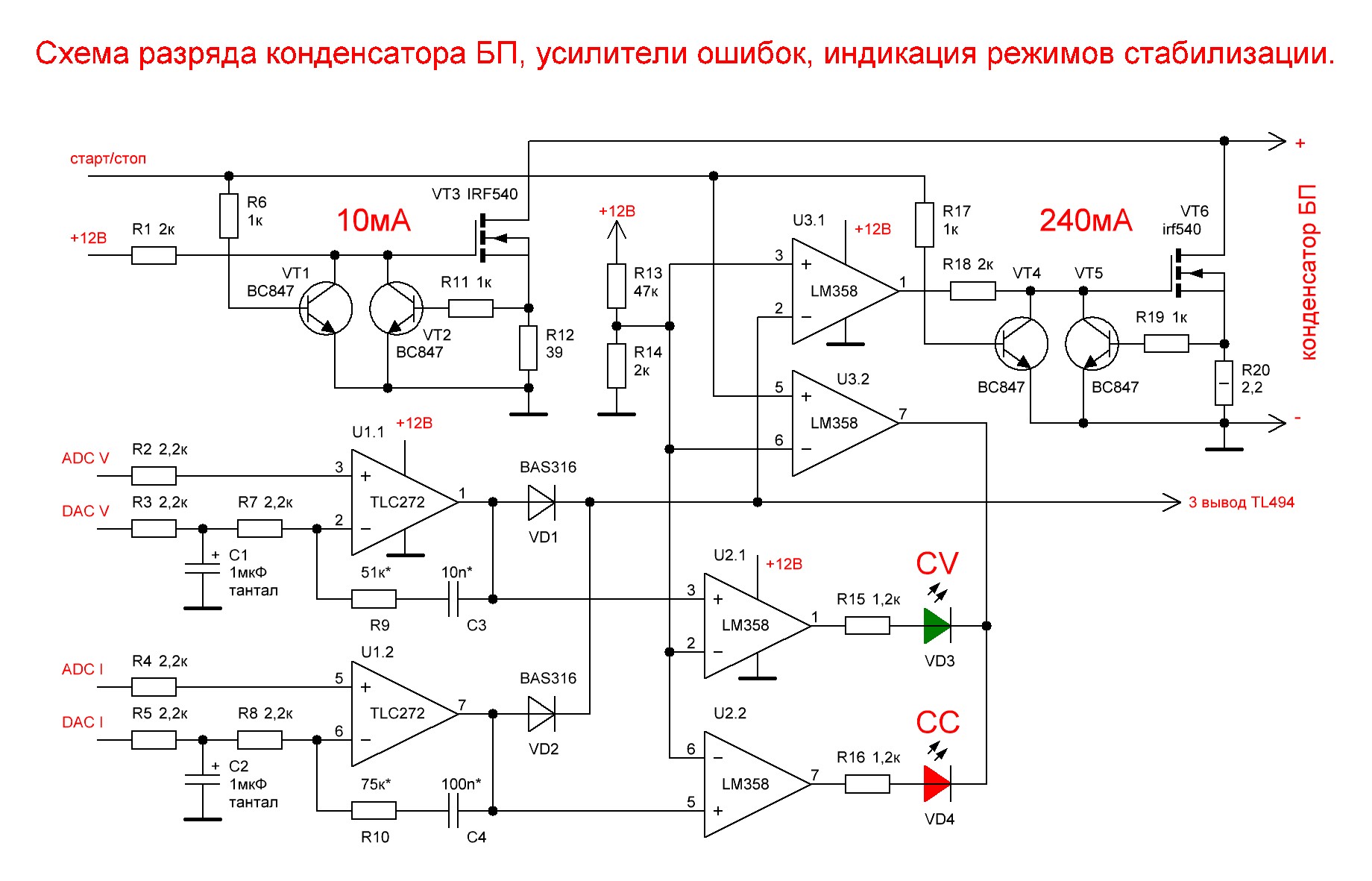 Доработанная схема разряда выходной ёмкости силового БП + усилители ошибок и индикация режимов стабилизации. Теперь для правильной работы не требуется подбор LM358 (U3.1). Тест ограничения при калибровке проходит без ошибки (раньше иногда приходилось подключать резистор по выходу силовой платы). Для этого добавлен генератор стабильного тока 10мА (VT3). С такими проблемами появляются иногда сообщения на форуме.