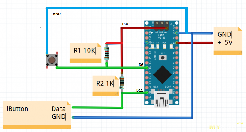 Переехал жить в другой дом и с удивлением обнаружил, что домофон в подъезде имеет ключи образца iButton (DS1990). В доме, где жил до этого, домофон уже давно открывался беспроводными RFID-метками, что дало мне возможность ознакомиться с целым пластом информации и даже приобрести не дорогой китайский копировщик для быстрого решения вопроса с ключами (посчитал, что самому собирать - дороже выйдет). Но оказалось, что в других домах, и даже в разных его подъездах, могут стоять домофоны не только разных систем, но и разных домофонных компаний! Это очень удивительно, хотя вполне логично. В общем, для меня это конечно шаг в прошлое, но нужно было решать вопрос с доп.ключами для родственников. Официально ключ стоит 100 или 150 рублей, так еще за ним надо ехать в головной офис (или доставят за отдельную плату). Разумеется, что такая ситуация совершенно не может устраивать жителя пост-советского пространства и он приступил к самостоятельному решению задачи. Итак, заказал записываемые болванти тут (можно тут, или даже тут), встал вопрос: как их быстро и без особых заморочек запрограммировать? Не хотелось тратить время на поиски корпуса, травление платы, тратить время на сборку и прочее. И всё потому, что требовалось мне всего лишь изготовить несколько ключей-копий для своих родственников и пару ключей на запас - то есть запрограммировать несколько ключей и забыть об этом (возможно на долго). На помощь пришла ардуино и вот эта ссылка. Использовал я правда не ардуино-нано, а ардуино-uno плату, но это не имеет никакого значения - светодиод на ней так же на 13м порту. По ссылке указана схема подключения как кнопки, так и самого iButton, но я внёс небольшие изменения: Текст свернут Что я сделал? В оригинальной схеме по ссылке, кнопка подаёт на цифровой порт D6 положительный потенциал. В моей схеме эта кнопка замыкает порт D6 на массу. Резистор R1 можно не ставить, если провода до кнопки короткие (используется внутренний резистор подтяжки). Что-бы эти изменения работали, потребовалось не много изменить скетч. Так же я обнаружил в нём ошибку, что если сначала прочитать ключ-источник и затем подать команду "w" с терминала (я использовал встроенный ардуиновский "Монитор порта"), то при подключении ключа-приёмника в него прописывался его же код. А если вместо "w" кратковременно нажать кнопку, то записывался код ключа-источника (как и положено). Так же мне не понравился вывод итоговой информации, где не удобно было сравнивать: попытка записи какого именно кода была произведена, какой код был в ключе-приёмнике изначально и какой получился после записи - всего этого не было в исходном скетче. Сделал на скорую руку - вроде работает. Еще мне совсем не понравился вывод считанного кода ключа в оригинальном скетче. Например, я привык, что HEX-вывод для 8 битных чисел всегда состоял из двух знакомест - например, FF для десятичного числа 255 или 0A для десятичного 10. Ну правда, код в первой строчке читается тяжелей (или не привычней?), чем код во второй строчке. Надеюсь, я не один в своих заключениях. В общем, привёл вывод к более привычному виду. так было: 1:3D:1C:A7:E:0:0:EA так стало: 01:3D:1C:A7:0E:00:00:EA Как сделать в арудине так, что бы выводимый байт всегда выглядел из двух знакомест, на ту же скорую руку я не нашёл. Потому использовал быстрые подручные варианты "в лоб". Вроде всё. Запрограммировал все 10 ключей. Спустился, пров