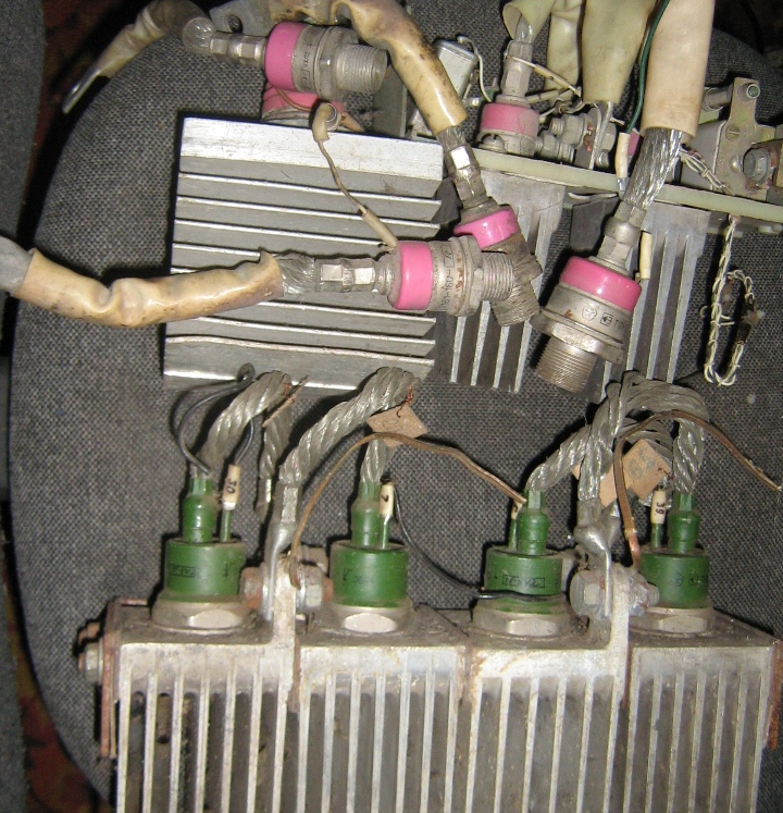 На фото может непонятен размер тиристоров,так вот диаметр зелёных 4см ,а радиаторы 8х8см
