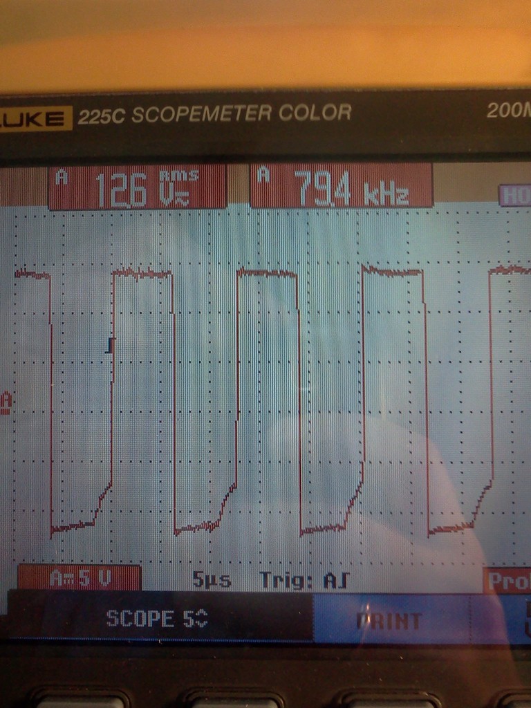 1) С подключенной силой осциллом убедиться, что на датчике тока импульсы не меньше 11 В, а на 3 ноге ШИМа - не меньше 1 В.