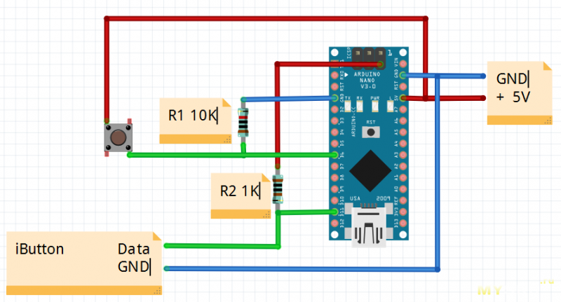 Комментарий к файлу: iButton connector со встроенным светодиодом. На цвета проводов не обращайте внимание - не совпадают! EN_KB_Diagram_1_Wire_I_Button_Reader.png [ 9.21 КБ | Просмотров: 17782 ]