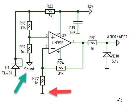 От второй ножки ОУ, через резистор 1 ком на левый (по схеме) конец шунта. И никаких "земель" и общих проводов по этим входам ОУ! Это измерительные проводники, которые измеряют падение напряжения непосредственно на шунте, а не на шунте + еще половине печатной платы с неизвестным сопротивлением и наличием блуждающих токов при высоких нагрузках.