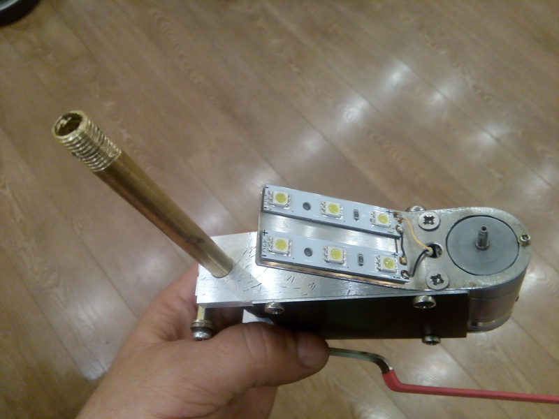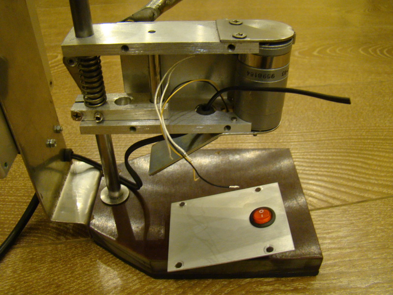 Изначально сделанный рычаг, оказался хлипкий, и пришлось его переделывать при помощи сварки. Основание - гетинакс 15 мм от древних выключателей 35 кВ. Снизу резина 6 мм. Сначала хотел использовать в качестве двигателя, моторчик 12 В от старого шуруповерта Скилл. Но закрутив его БП ОКА 275, зачесал репу. Без нагрузки 1,5 А, втыкаешь ему в вал деревяшку - 5 - 6 А. Грубо 12х5=60 Вт. И обороты у него бешеные. А мне хотелось что бы была плата управления мотором, как в оригинале - без нагрузки около 100 оборотов, как только пошла нагрузка, сразу добавляет до мах. Идея схемы, падение напряжение на резисторе который включен последовательно мотору. Короче резистор нужен размером со школьный реостат. Пришлось отказаться от этого мотора, к тому же он еще оказался очень горячим. Не расчитаны шуруповерты на длительное вращение. Поставил в итоге ДПМ-30. Всю жизнь подобные моторы в ручных сверлилках использовал. Ну пока еще все в вот таком состоянии - не доделано. Жду 2 LM-ки и патрон с Али. Потом продолжу как все доделаю.