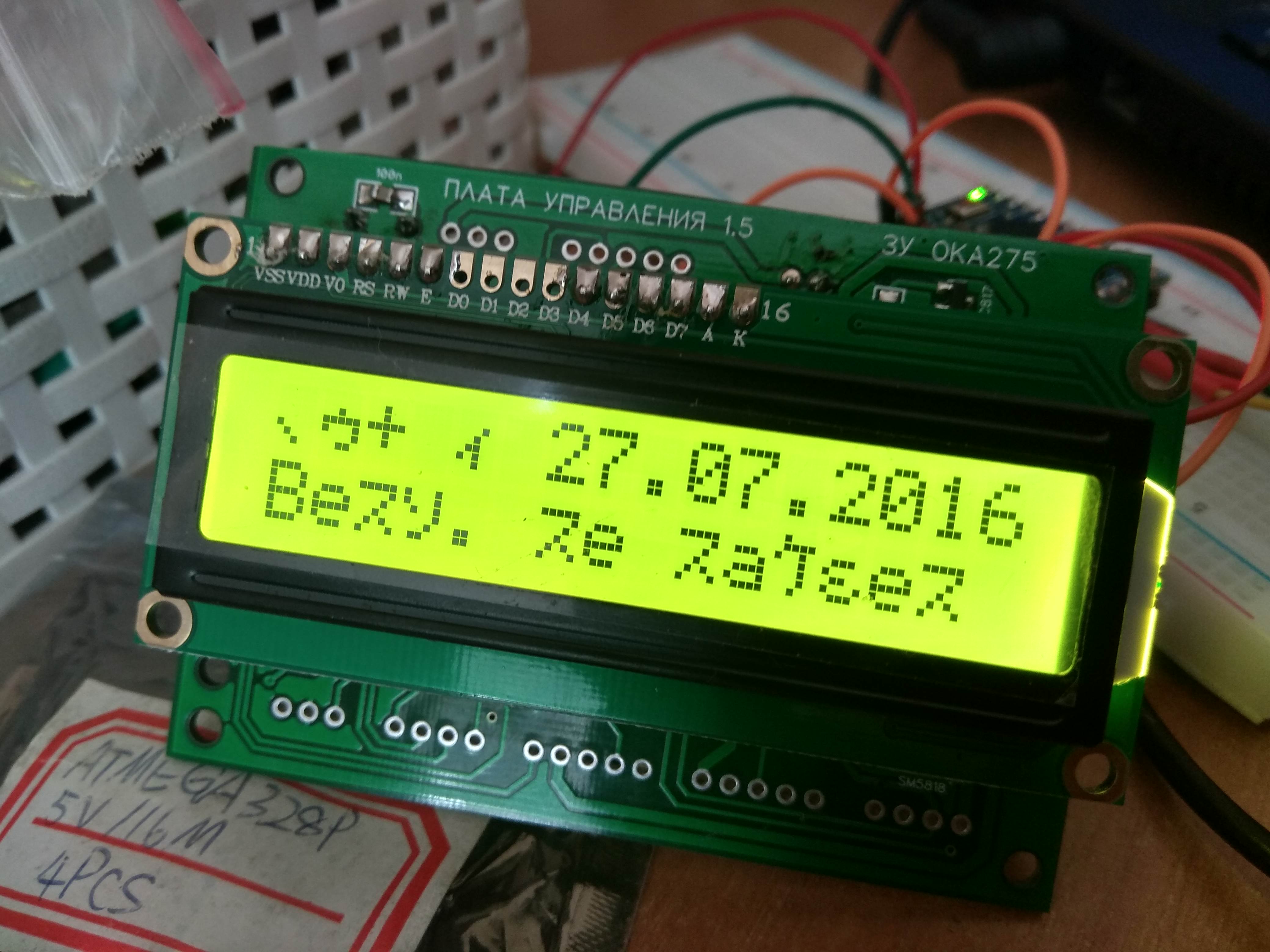 Такие кракозяблы на дисплее (дисплей еще и неудачного цвета взял). Кварц менял, атмега шил несколько раз...