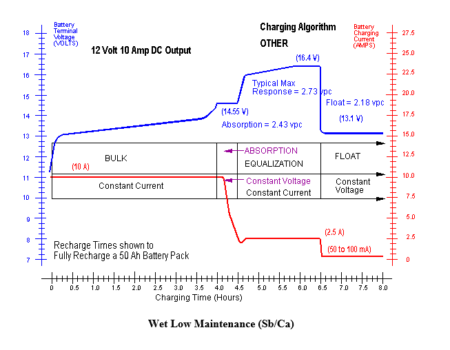До достижения напряжения на клеммах АКБ 14,55В идёт зарядка постоянным током, далее идет зарядка постоянным напряжением 14,55В до падения тока до 2,5 А, далее постоянным током 2,5А до достижения напряжения 16,4 В, пол часа держит каким-то образом и напряжение 16,4В и ток 2,5А, далее постоянная напруга 13,1В и до бесконечности, ток должен не превышать 100 мА