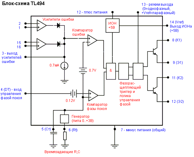1-2, а также 15-16 ножки есть входы операционного усилителя. Это четко видно по блок-схеме. Они выполняют роль компараторов. Как работает компаратор объясняется здесь https://www.youtube.com/watch?v=bwNZcf9K5IE В классической схеме БП на 1ю ногу приходит обратная связь с выхода БП, а по второй ножке задаётся порог сработки компаратора. Если напряжение на 1й ноге превысило напряжение на второй ноге, компаратор перещёлкнется и выставит на своем выходе лог.1, что запретит TL494 выбарабывать импульсы. Напряжение на выходе БП, а значит и на 1й ноге начнет падать, пока она не станет ниже, чем на второй, после чего компаратор вернется в исходное состояние, запрет на выработку импульсов будет снят, напряжение на выходе БП начнет расти, пока ситуация не повторится. Так и работает стабилизация напряжения, вращаясь вокруг всего этого. Соответственно, если мы изменяем пороговое напряжение на 2й ноге, то можем менять выходное напряжение БП. Точно также можно управлять напряжением и по 15-16 ножкам, т.к. элементы ОУ одинаковые. Зачастую, управление по напряжению делают на первом элементе, а ограничение тока на втором. А можно без них вообще обойтись и сделать компараторы на отдельных операционниках, как это сделано в схемах NuSen. В этом случае, выходы компараторов нужно будет подключать через разделительный диод сразу к 3й ножке. Так будет меньше проводов, а значат и наводок. И проблем.